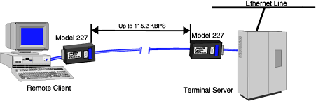 Here we have two communicating data devices a PC and a terminal server associated with an Ethernet Local Area Network (LAN). The PC user wants to be part of the LAN, but is located some considerable distance away from it - measured by Ethernet LAN rules - say a few miles. The PC users want access to the LAN and will have to transmit not at 'full LAN' rates, but say at significant rates of up to 115.2 KBPS. This will be asynchronous, which is in the nature of a user sitting at a keyboard, and full duplex.
