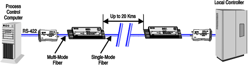 ![]() Fiber optic cable as a transmission medium has, for some time, been employed in the long haul or wide area network environment. Its advantages with respect to large bandwidth, immunity to electrical interference and security are well known. In recent years there has also been a steady growth in the use of fiber optic cable in the premises environment. As fiber optic cable prices have decreased and cable connectorization has become easier to accomplish, this medium has become increasingly popular for implementing premises data communication networks - networks for either in-building or manufacturing plant use. When fiber optic cable is employed in long haul or the wide area environment it is of the single-mode variety. In very elementary terms you can think of the cable as allowing only a single 'ray of light' to propagate from one end to another. Why is it single-mode? Because this type of fiber optic cable has very low attenuation and consequently can achieve the long distances between repeater required in this environment. When fiber optic cable is employed in the premises environment, it is generally of the multi-mode variety. Again, in very elementary terms, you can think of the cable as allowing a multiplicity of 'rays of light' to propagate from one end to another. Multi-mode fiber optic cable has more attenuation than single-mode fiber optic cable - you often lose the 'rays' propagating near the walls of the cable. However, this is OK. In the premises environment you do not have to go as far as in the wide area network environment and your signals can tolerate the increased attenuation. Multi-mode fiber optic cable is also much less expensive than single-mode fiber optic cable. This works for the premises environment where cost is a much more sensitive issue. There has been more and more activity in taking data being transported on a premises data communications network and sending out on a wide area network. One case may be taking data on a corporate LAN at one location and then sending it out onto a wide area network to a corporate LAN at another location. As the employment of fiber optic cable as a transmission medium has grown carrying out this task has come to mean converting the fiber optic signals from the multi-mode cable on the LAN to signals appropriate for the single-mode cable used in the wide area network. That is, a multi-mode to single-mode conversion has to be done. The Model 279 is well suited to this task. The illustration above shows a pair of Model 279s being used in just this type of application. Here we see a process control computer at one location communicating with a local controller on a factory floor, some distance away, say in excess of 10 km. Considering that so much of the communication is being carried out in the factory environment where electrical interference is so much of the problem, it is desired to effect the communication be fiber optics as much as possible. Both the process control computer and the local controller send and receive data through their RS-422 interface. The differential signaling of RS-422 provides some protection against electrical interference. However, it can not compete with fiber optic transmission. Thus, at both ends of the link we show a conversion from RS-422 to multi-mode fiber optic signals using the Model 272. The resulting communication can employ the low cost multi-mode fiber optic cable to out to the walls of the building where the computer and controller are located, the boundaries of the respective premises. At these points conversion of the multi-mode fiber optic signals to single-mode signals can be carried out using a Model 279 at either end. The Models 279 can then be linked by single-mode fiber optic cable which can reliably support transmission over the 'longer than premises' 10 km + distance. |