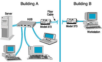 The Model 373 is just the right 'pain killer' to end this 'headache.' It will allow you to connect an isolated station to the LAN using low cost, multi-mode, fiber optic cable. While meeting the CSMA requirements, the low cost, multi-mode, fiber optic cable allows the isolated stations to be extended a full 2 km from the hub. Of course, you will need a Model 373 at isolated station end to convert the electrical signal to/from copper to light for fiber optic transmission. You will also need another Model 373 at the hub end to do the same conversion-unless the hub has this already built-in. This is just like the illustration shows. Using the Model 373 allows you to get significant range extension with your LAN.