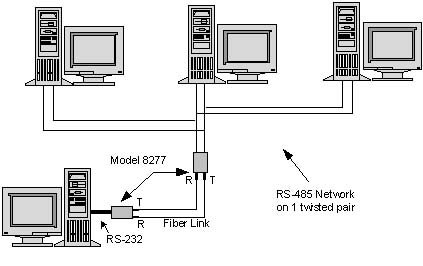 Operation in the RS-485 multi-drop or the ring environment requires that all devices connected to the line have some level of intelligence in order to establish an orderly flow of data. When RS-485 (half duplex) mode is selected, the Model 8277 controls the Receive Data line on the electrical interface. When data is not received (no light on fiber) by the optical receiver for ten microseconds, the output of the Receive Data electrical transmitter is tri-stated. In RS-485 mode this enables many transceivers to communicate on the same twisted pair. When the RS-485 two-wire mode is selected, half-duplex data is transmitted and received on the same twisted pair.