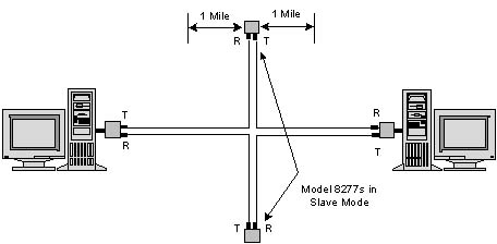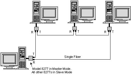 In an optical point-to-point configuration, two Model 8277s are connected back to back to form a simple, high-speed, full-duplex optical link. In optical ring operation, two or more 8277s are cascaded in a ring. A ring consists of one master modem and two or more slaves (see Figure 2). The slaves pass received optical data and transmit data from their electrical interface to their optical transmitters.