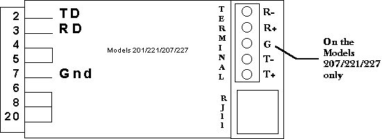 3.2.1 Terminales de tornillos - Los Modelos 201/209FT tienen 4 terminales con tornillos marcados T+, T-,R+ y R-. Los Modelos 207/221/227 tienen 5 terminales con tornillos mar-cados T+,T-,R+, R-, y GND (Tierra). Cuando se conectan dos Modems juntos el T+ de uno vá al R+ del otro mientras que el T- vá al R- y vice versa. El terminal de tierra no es ne-cesario usarlo pero está disponible en caso que el equipo lo requiera.