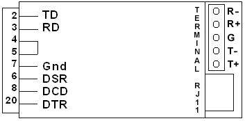 3.2.1 El Modelo 224 viene con cinco terminals marcados T+, T-, R+, R-, y GND (tierra). Cuando los dos modems se conectan juntos la línea T+ de una unidad se conecta a R+ de la otra, mientras que T- se conecta a R-, etc.