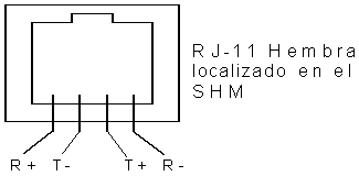 3.2.2 Conector RJ-11 - El Modelo 224 viene equipado con un conectór RJ-11. Solamente 4 de las 6 posiciones son usadas. Si se ordenan con lo opción del conectór RJ-45 (P2) entonces solamente los 4 pines del medio son usados Las señales en los pines son las siguientes: