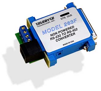 The Model 263 power stealing RS-232 to RS-422 interface converter offers the user the benefits of other Telebyte converters without the problem of supplying power. With only TD, RD and Ground the Model 263 will provide operation over 8,000 feet of twisted pair into a load of 120 Ohms.